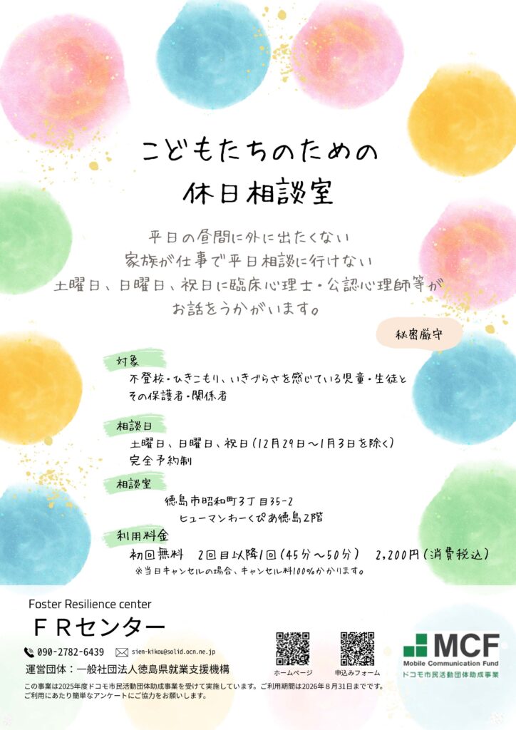 ひとめが気になって、平日の昼間に外に出たくない、平日は仕事が休みづらくて相談にいく時間が取れない等で、相談することを諦めている方、土曜・日曜・祝日に完全予約制で臨床心理士・公認心理師等が相談支援を行います。学校生活がうまくいかない、いじめや発達特性に伴う生きづらさを抱えるこどもやその保護者を対象に、安心できる居場所と相談の機会を提供し、こども達が自分らしい歩みを実現できるようお手伝いします。
